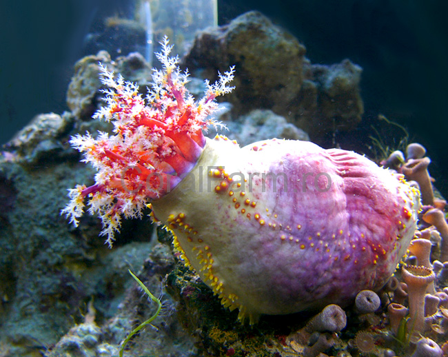 It prefers an established reef aquarium with room to move about, and large amounts of live rock from which it receives a majority of its food. Once it finds a favorable location, usually in a high current area, the Sea Apple will generally stay there. Protect all intakes on pumps and power heads, to eliminate any possibility of being sucked in. It is very sensitive to high levels of copper-based medications. Sudden changes in pH or salinity can cause it to shed its oral tentacles. Do not house these cucumbers in an aquarium that contains any fish that may pick on its tentacles. Generally, any fish that is prone to pick on feather dusters, will pick on the tentacles of the Indonesian Sea Apple. These fish include; Butterflyfish, Large Angels, and any species that is listed not safe with invertebrates. When feeding, it will extend its oral tentacles into the current to filter out food. As the food is trapped, it will then draw its entire tentacle into its mouth. In the aquarium, it will need to be fed a diet of phytoplankton - frozen, liquid, or dried - on a daily basis. |