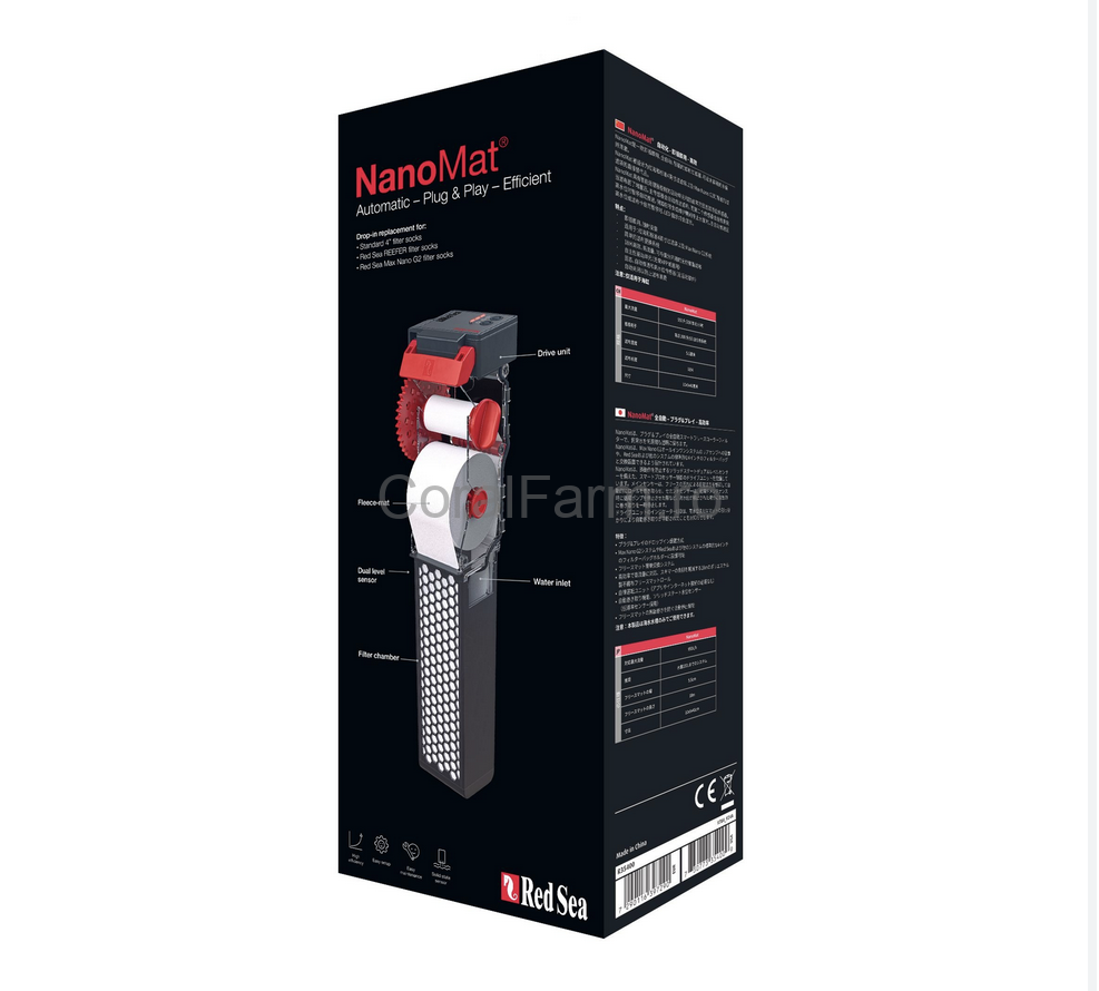 ReefMat Nano (denumit uneori NanoMat) este un filtru automat cu rolă de fleece, dezvoltat de Red Sea, special conceput pentru acvarii marine de dimensiuni mici, cum ar fi seria Red Sea MAX NANO. Este un sistem de filtrare plug-and-play care menține apa cristalină cu un efort minim de întreținere. Mai jos găsiți o descriere detaliată și specificațiile tehnice ale produsului.